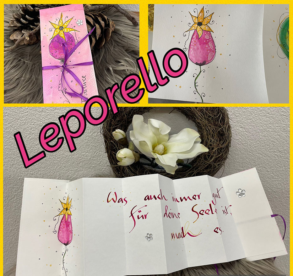| Geschrieben mit der Speedballfeder in unterschiedlichen Farben (Tusche) Format: Höhe 14 cm; Länge 48 cm inkl. Applikation und Außenhülle aquarell mit Band Preis/Stk. Euro 11,50 zuszügl. Versandkosten |
